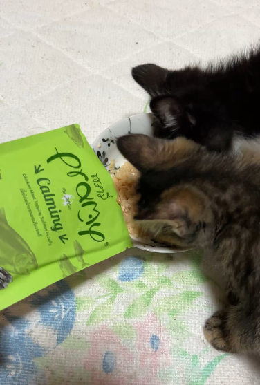 生後2ヶ月以上対象のフードなのに、母猫が食べようとした隙を狙って生後1ヶ月半の仔猫たちでもむしゃむしゃ食べています笑