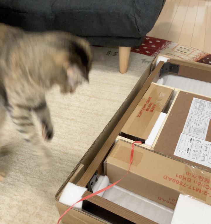 わたしは元気にコタツの設営をし、里芋さんは元気に箱の中の赤いヒモにじゃれついてホッピングねこしています。