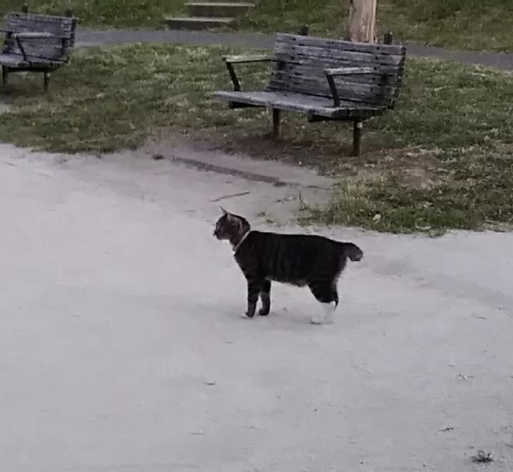 朝の公園を歩く猫ちゃん。寒々しいように見えますが、早朝のためか色合い