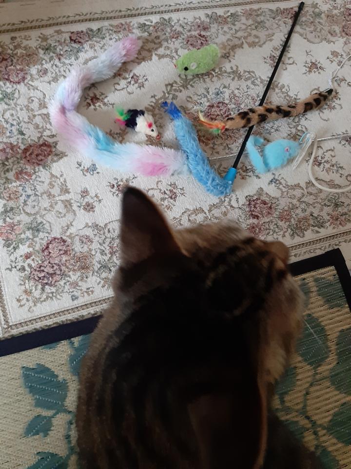 日中起きているときに持ってくる時は、猫じゃらしだと「コン、コン」と柄が階段にあたる音がするので「お、持ってきた!」とわかります。