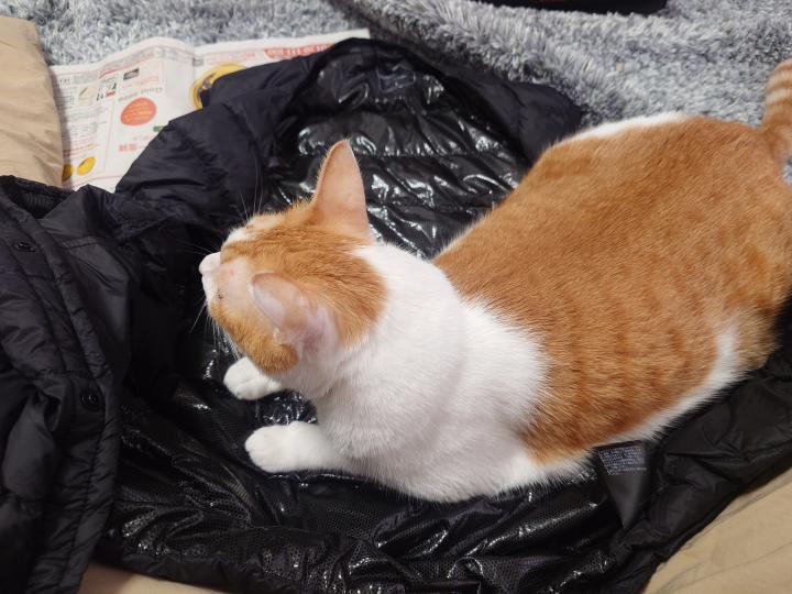 こたつを出す前に、親父の羽毛チョッキの上で待っててもらいました。