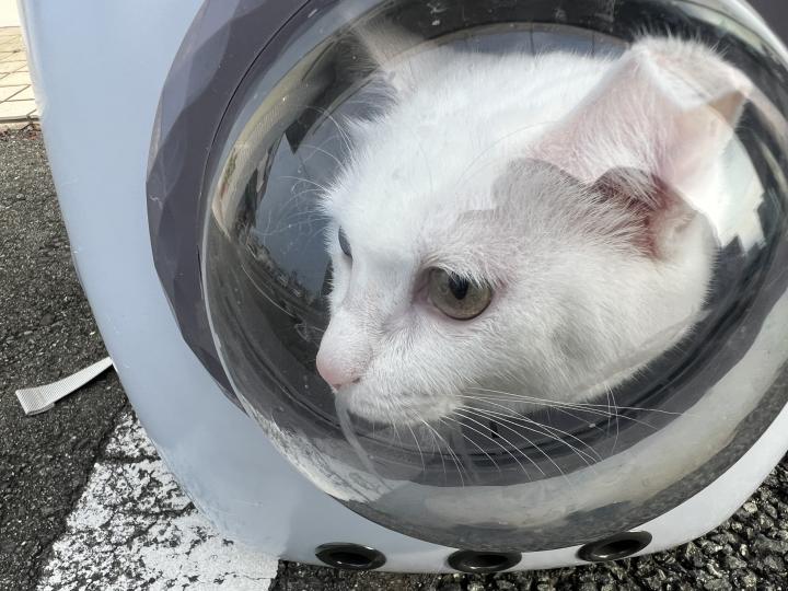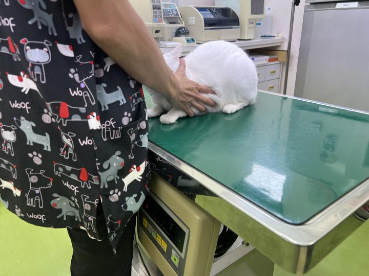 診察台から逃走、洗濯ネットに入れられました。それから注射をしようとしたら、少し触れただけでまた大暴れ!やっと注射ができました。おなかのしこりは痛がったり気にしたりすることがないし、避妊手術のときの傷の癒着ではないかとのこと、様子見です。