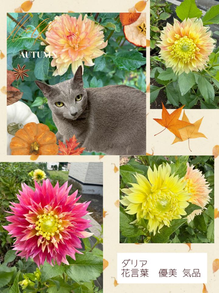 写真のダリア、ライちゃんのバックに写っている以外は全部同じお花なんですよ。