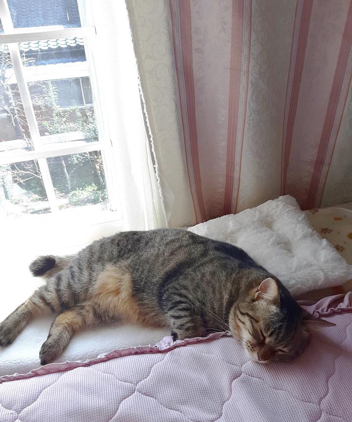 ペット用ヒーターをつけると、スヤスヤ眠っている姿を多く見かけるようになりました。