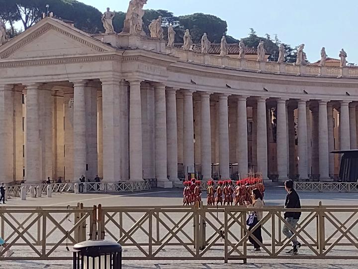 初めて見た、パパ様護衛のスイス衛兵による行進…ド派手なユニフォームで、おもちゃの兵隊さん(^^)
