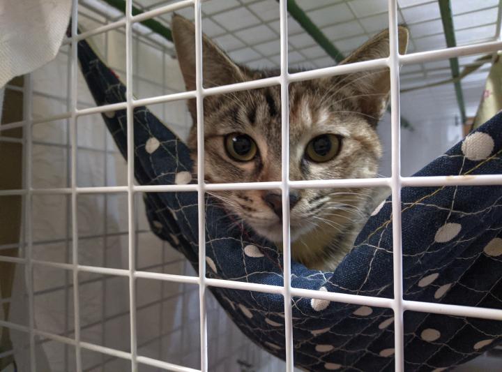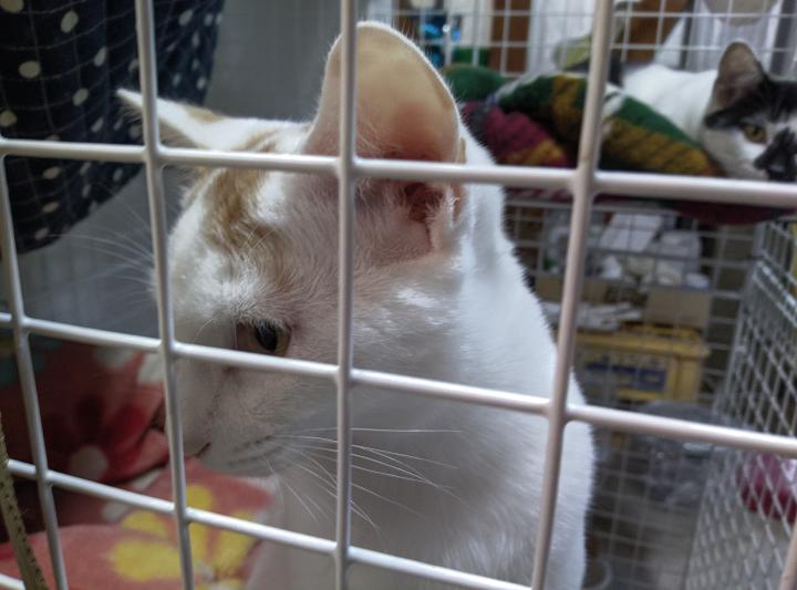 キョウもゲージ内で撫でることを許してくれますが、まだ撫でられて気持ちがよいとか嬉しいとかといった気持ちはない様子。