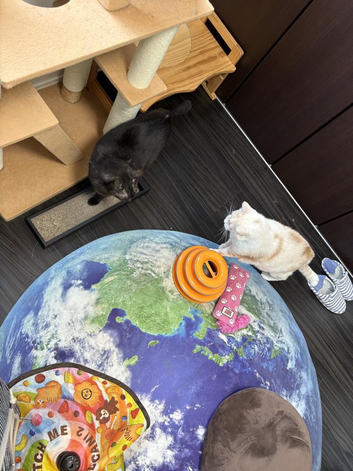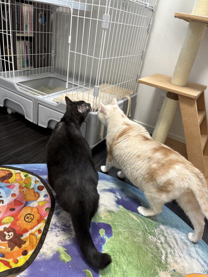 しろうが、なぜかのんちゃんを部屋から追い出したので、そのまま2人とも階下まで行ってもらって柵を閉めました