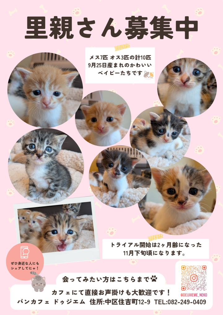 広島市中区で猫の保護活動をしています。 「保護」「ケア」「新しい家族との縁結び(譲渡)」に注力しており、定期的に譲渡会を開催しています。 気になる子がいましたら、お気軽にメッセージください! ...