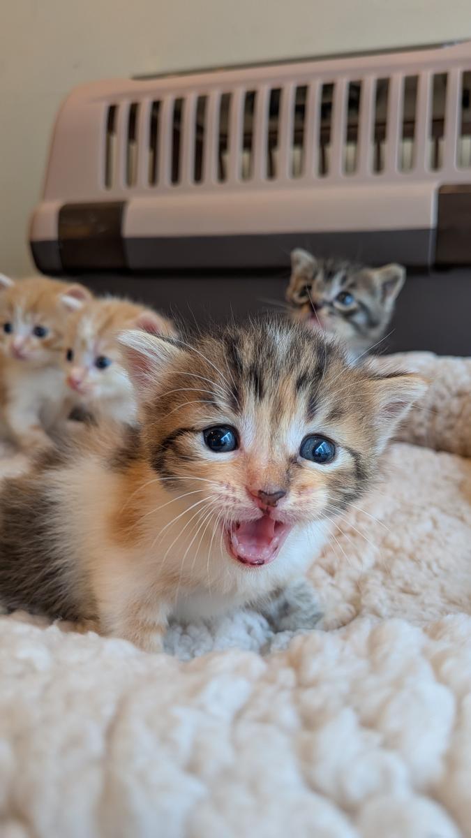 茶白の男の子3匹と、キジ白の女の子1匹(=^・^=)