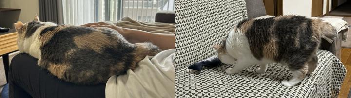 膝の上でくつろいだり、新しい玩具で遊んだり。