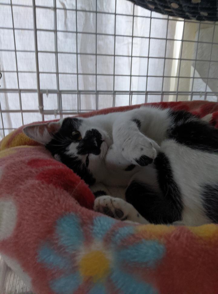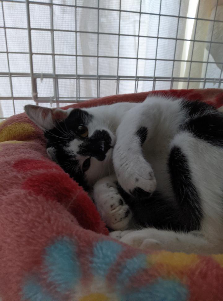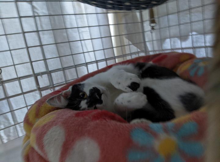 いつもは遊びはゲージの外からおもちゃを使っていましたが、今日は、昨日作った靴下を利用した巨大猫じゃらしを持って私がゲージの中に半分入って。