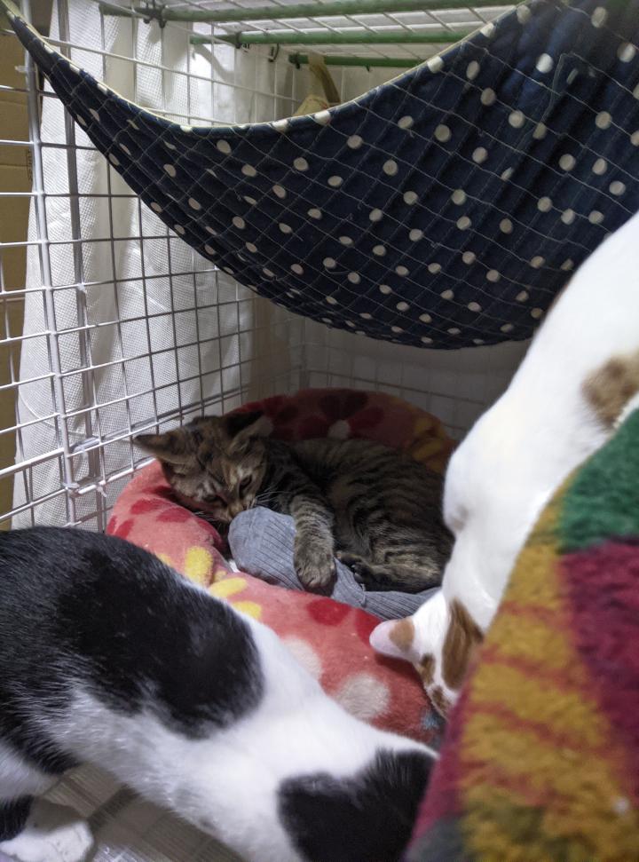 みんな新しい遊びにまだ慣れませんが、人の手との距離が近くなったというか、家猫っぽく遊んでいました。
