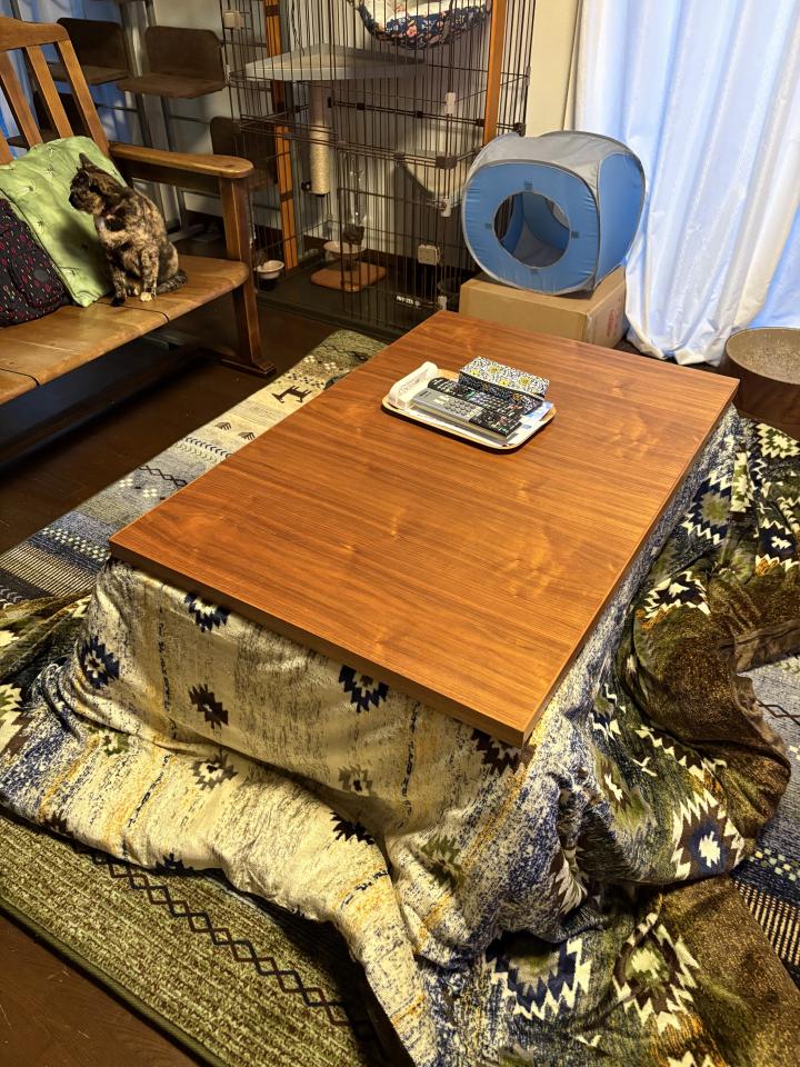 チカコは、一日中こたつの周りでぬくぬくと過ごしています。