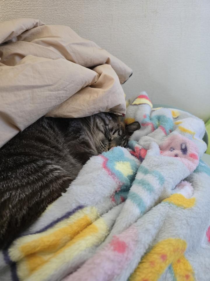 アクアが暖かいカービィの毛布の上で寝ています。