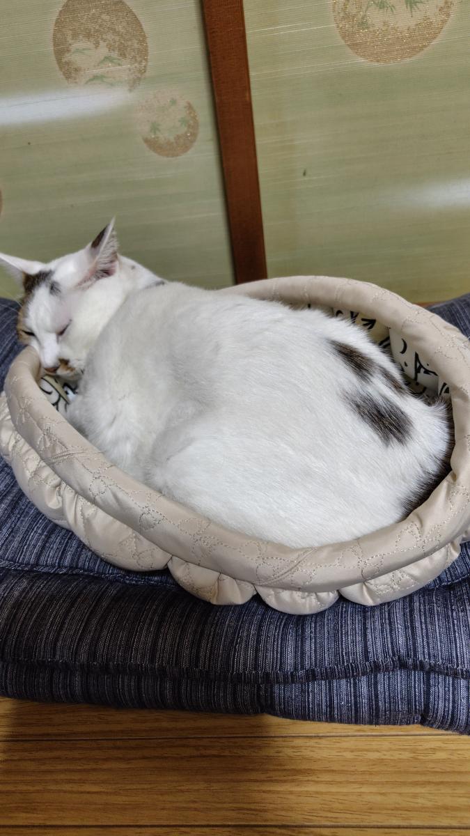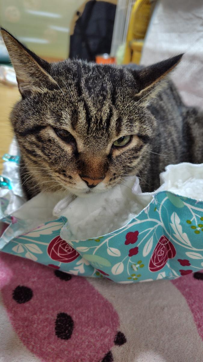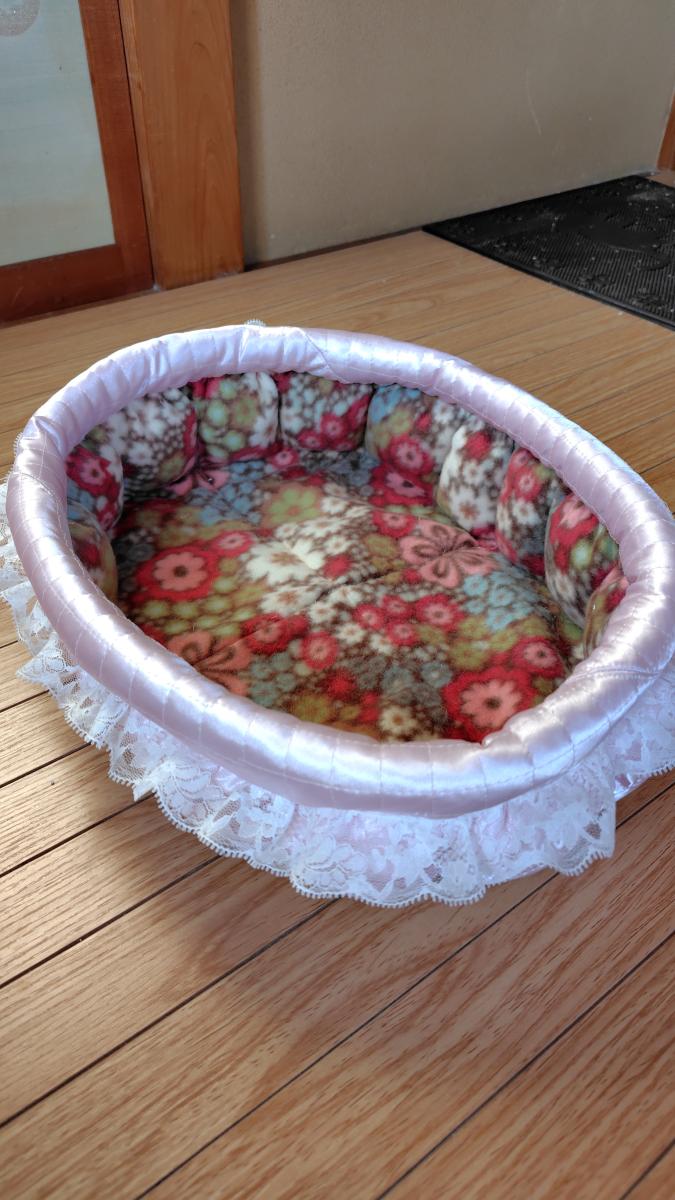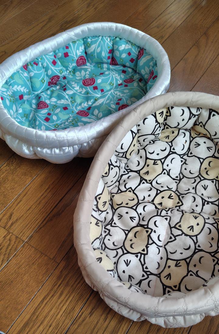 片面は猫の毛が付きにくいサテンのキルティング生地にしたみました。