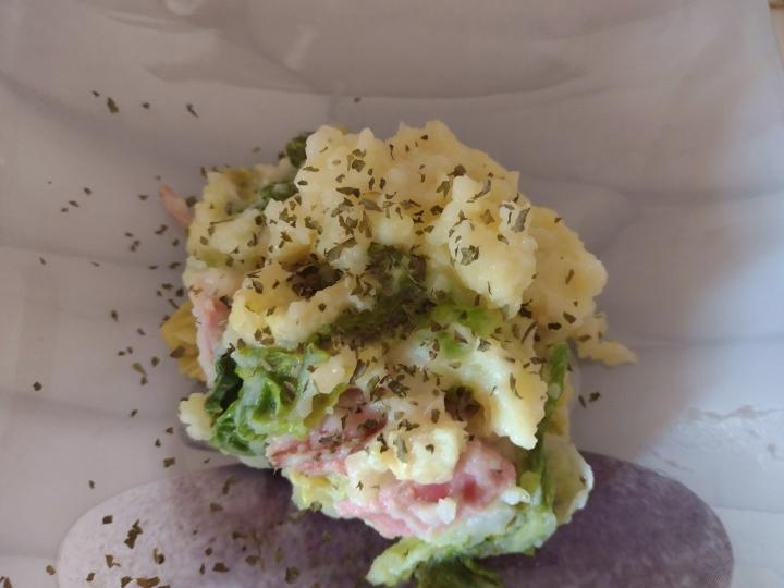 適当に作ったマッシュドポテトに、家にあったキャベツとベーコンを適当に炒めて併せる