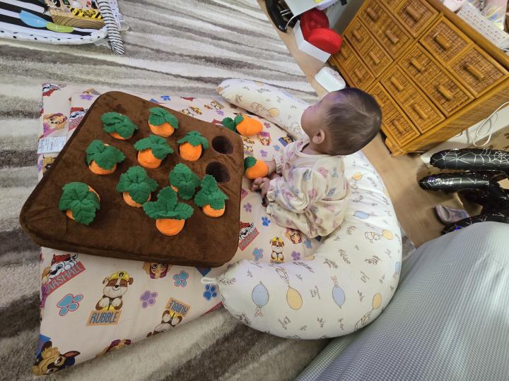 UFOキャッチャーで前に取ったニンジンクッションを出しました。遊んでくれています。