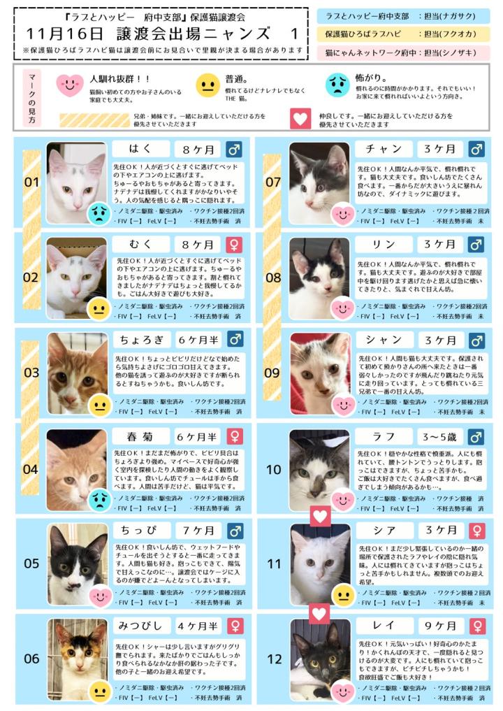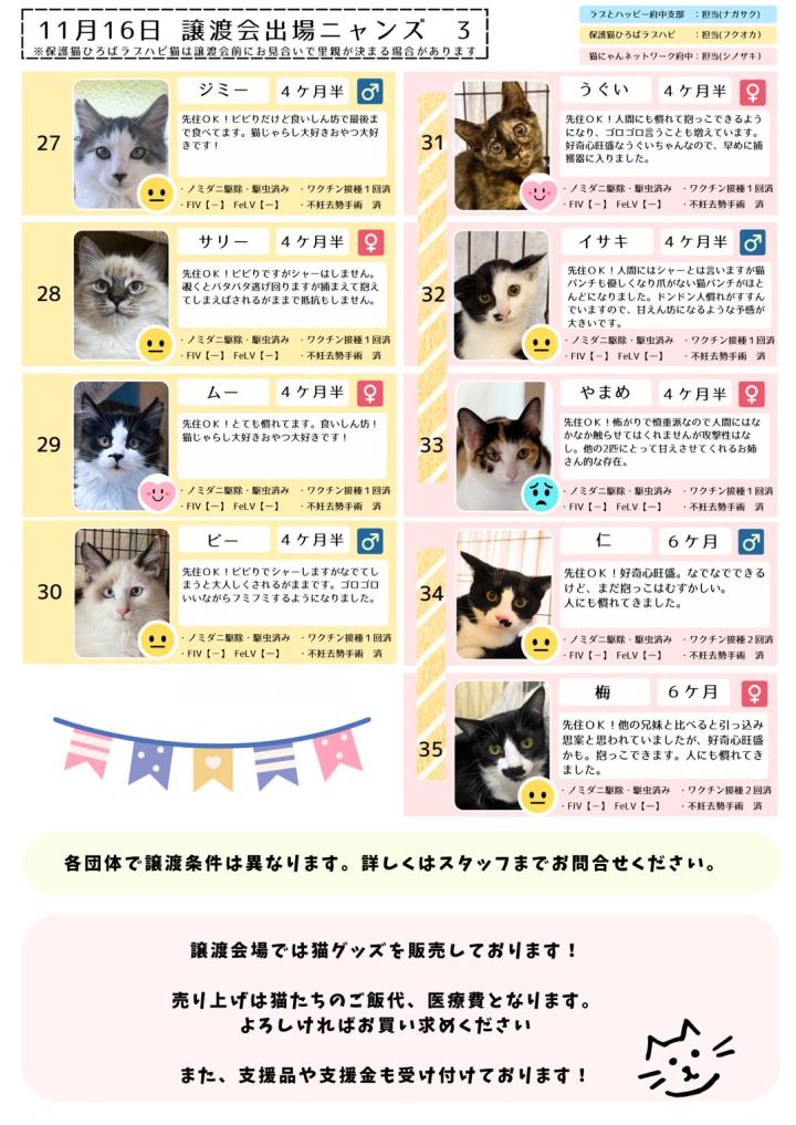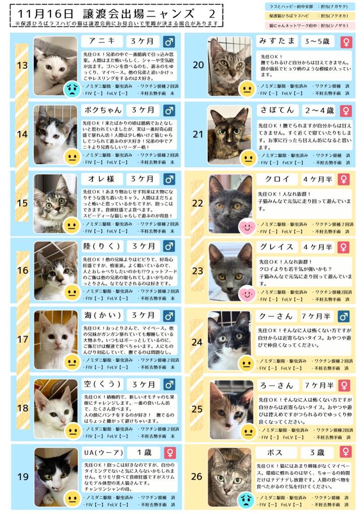 保護猫ひろばラブハピさんからは、9頭、猫にゃんネットワーク府中さんからは、5頭、ラブとハッピー府中からは、21頭が参加します。