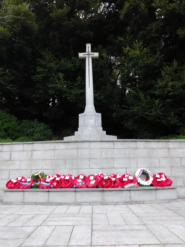 鬱蒼とした木立を歩み進むと、十字架を仰いだ白いモニュメントと、美しく刈り込められた芝生に、1,518基の墓標が陽光に照らされているのが垣間見える モニュメントには式典が行われていたのであろう沢山のポピーの赤いリースが捧げられてあった