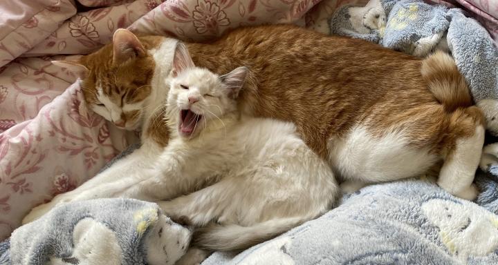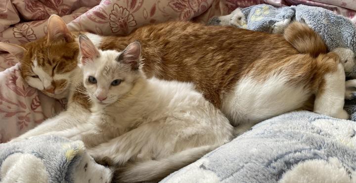 今年八月にうちのにゃんこになってくれたナナちゃん(生後3か月半♀)と昨年五月にうちのにゃんこになってくれたララちゃん(生後1年7か月♂)がめっさ仲良しで、毎日ラブ🫶してるんです。