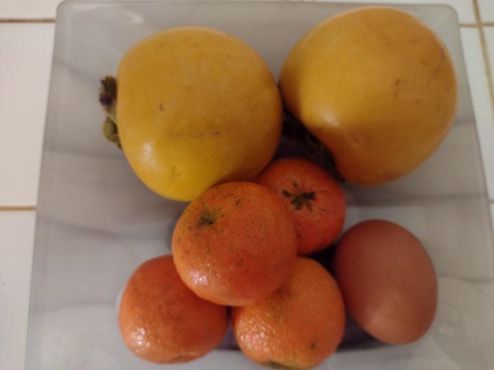 秋らしい果物、カキとマンダリーノ(柑橘類)、手で皮が剥け種無しミカンみたい