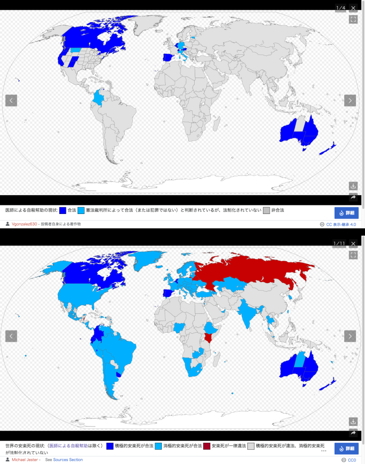 上は自殺幇助(罪を問われないも含む)、下は安楽死容認国