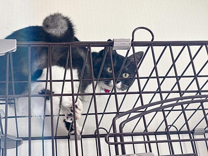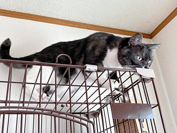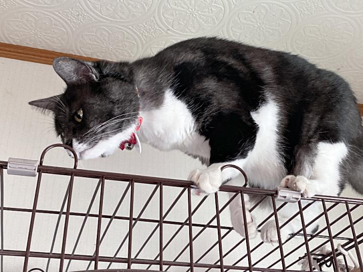 …玄関フード内のチョビのケージの上に乗り、匂いを嗅いでいます。