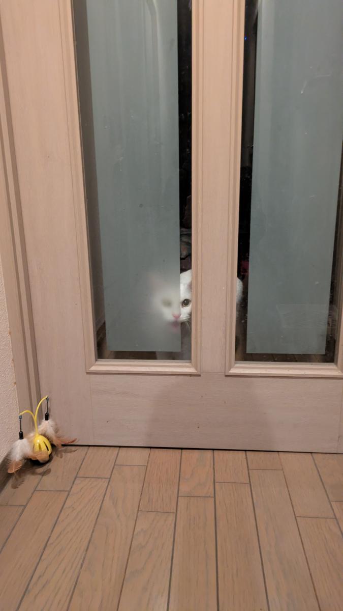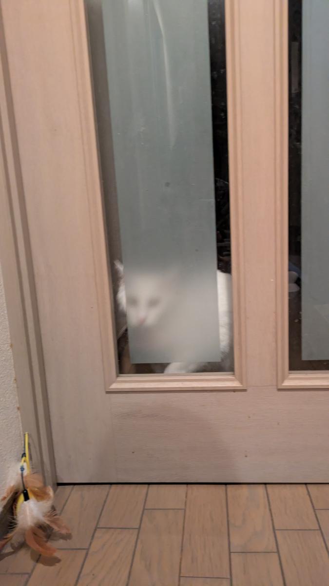 帰宅後のちーちゃん。扉の向こうで待ち構えていた😽