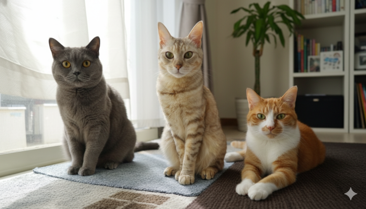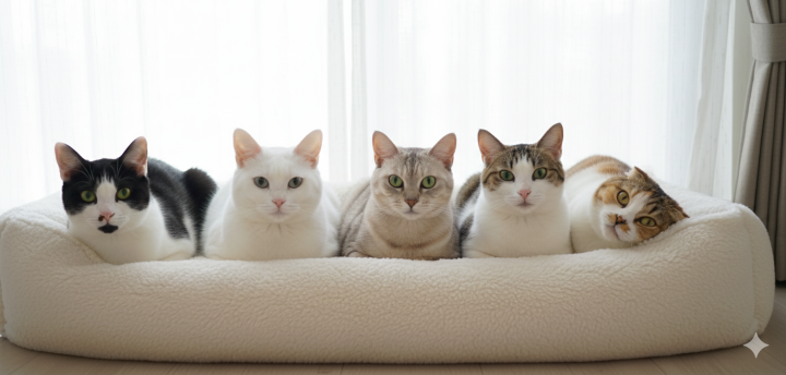 5匹写真を、それぞれ5枚選択して「この5匹が仲良くソファーに並んでいる画像作って」とお願いしたら