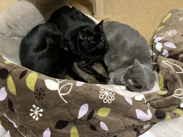 ホットカーペットを敷いて毛布で輪っかを作ってる。その中に母猫とリキが団子で寝てる。もっと真冬になる前にもう一つくらい暖房機器を加えたい。