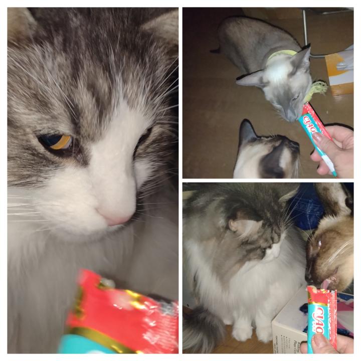 皆んなも ちゅーる欲しがる、が、マグロ味が気に入らず、全く舐めない🐱