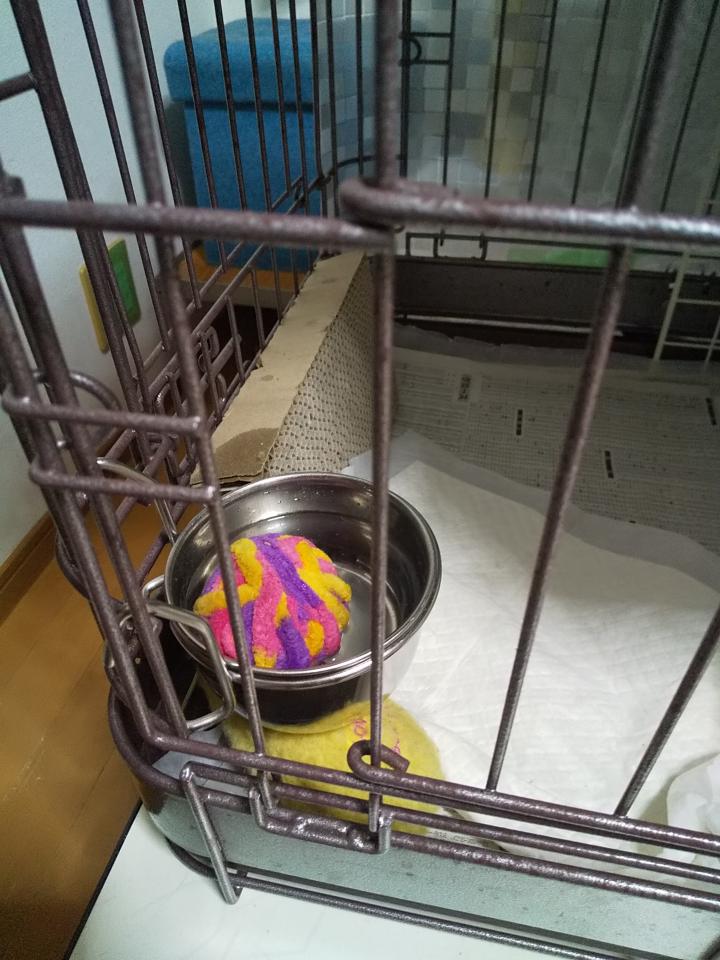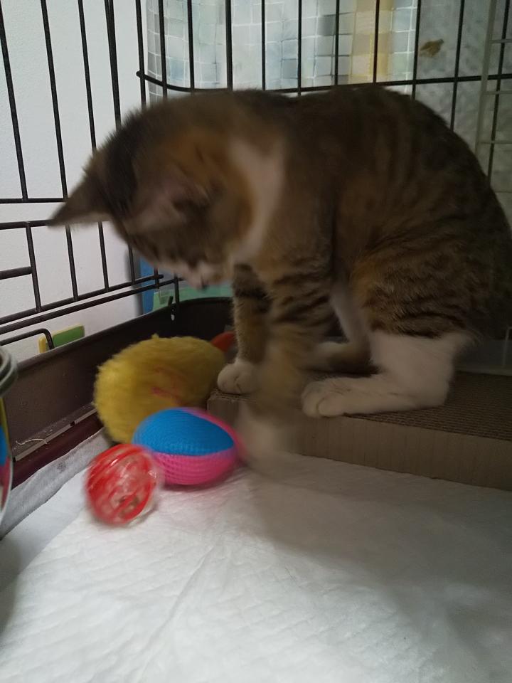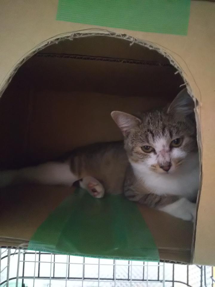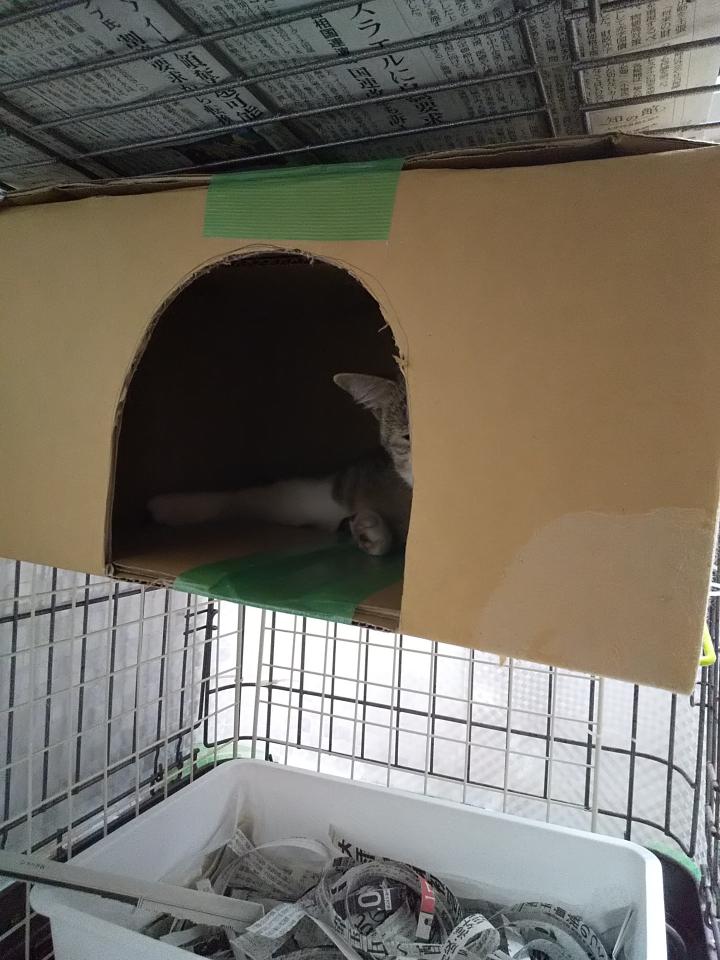 こねこちゃんは私が近づくとBOXに逃げ込むので、BOX内のこねこちゃんを眺めながら飯でも食うかと近寄りました。そしたら匂いに吊られてこねこちゃんが降りてきました。