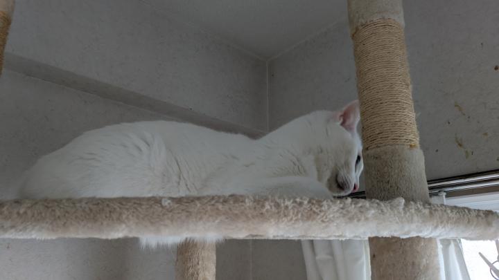 大きいキャットタワーの上に居たので、後ろから触ったり、頭なでなでしたり…喜んでくれてたと思う。