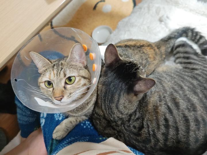 ある日ふと見ると腕の内側の毛がなく舐め過ぎて傷に…と言うことで舐めないようにカラーをつけてるキジ子