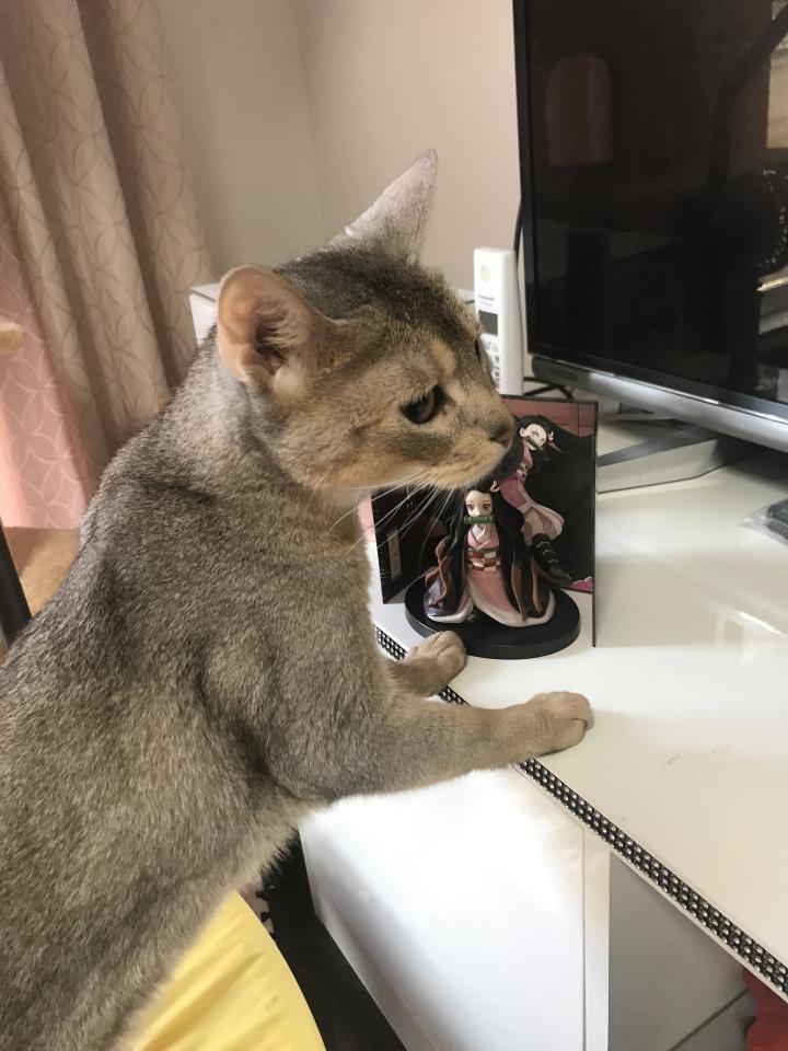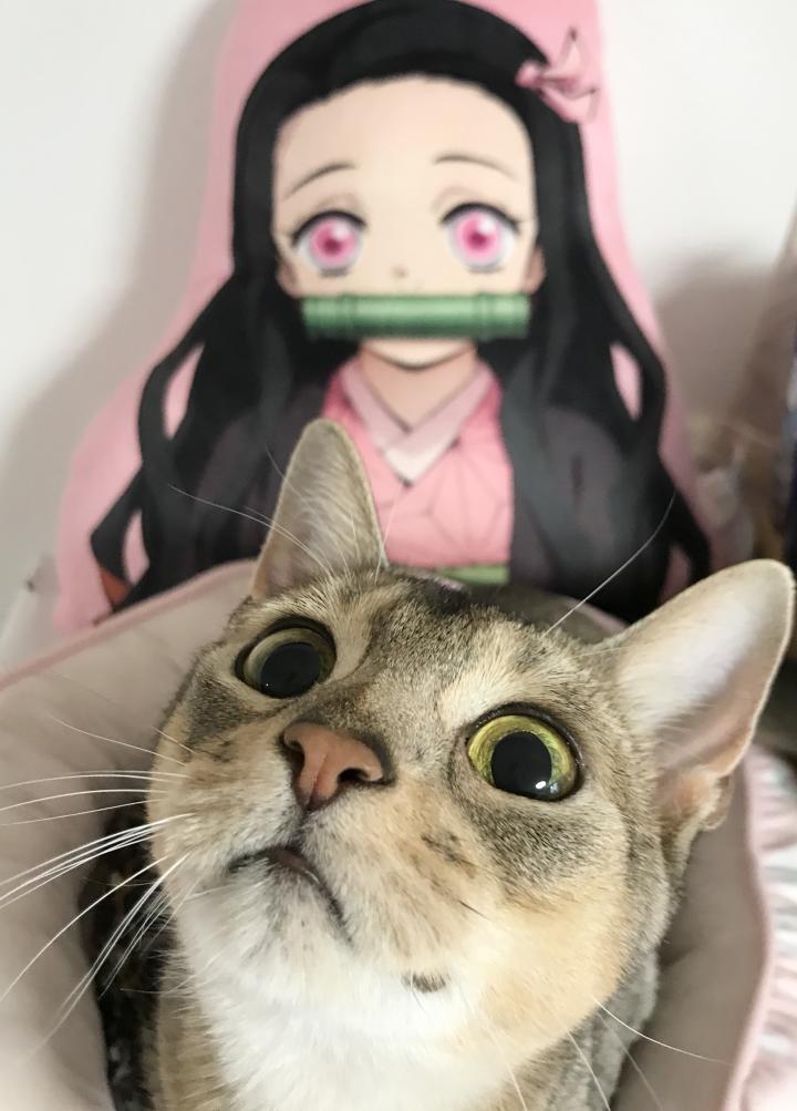 それでも仲良くしようと娘なりに大好きな禰󠄀豆子を背景にビビを撮ったりしてた😸