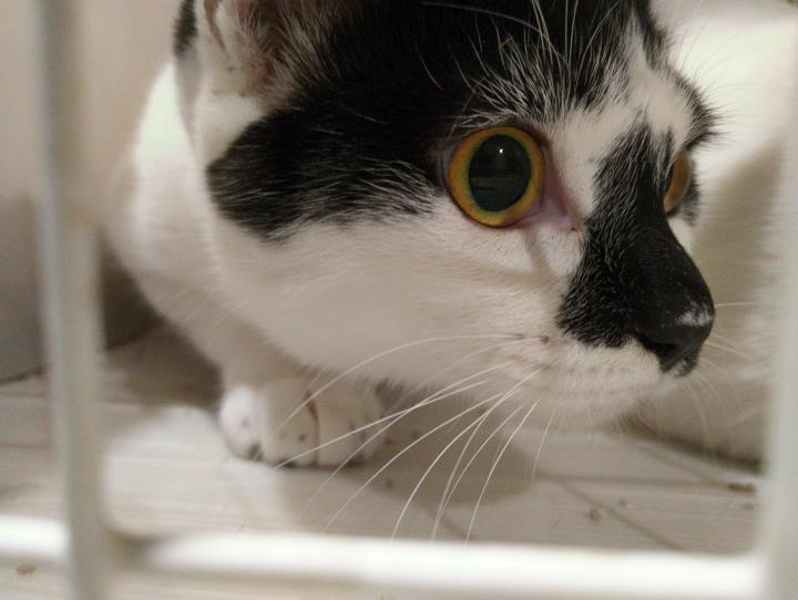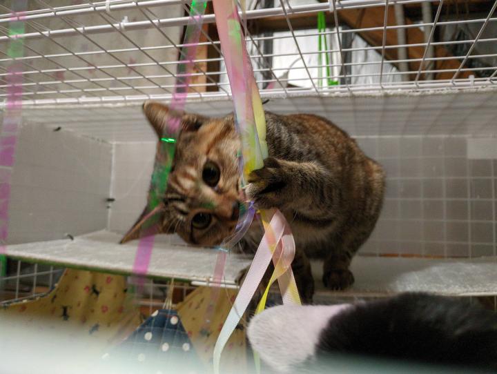 写真はおもちゃを狙う本気モードのキョウです。この子は気持ちで表情がぐっと変化するのが魅力です。