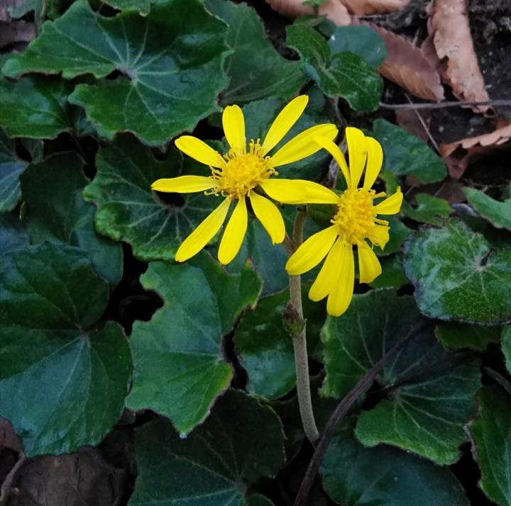 ツワブキです。庭などに植えられます。画像は普通のものですが、葉に斑が入ったもの