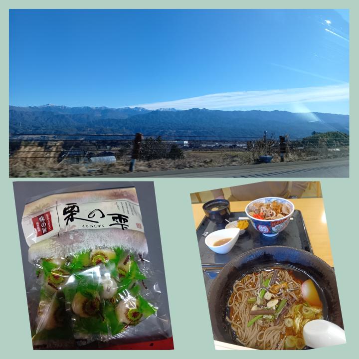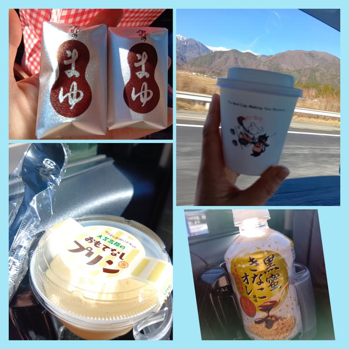 行きに寒かったので、駒ケ岳SAで買ったコーンスープ片手にアルプス眺め(写真右上)