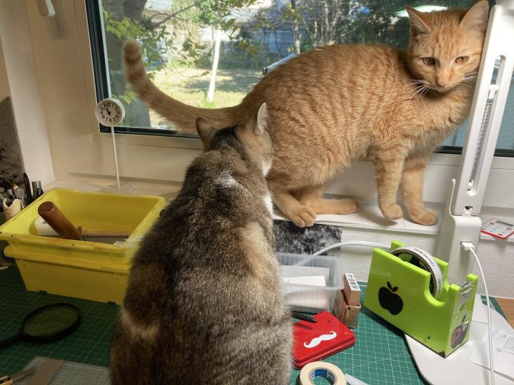 狭い台の上で二人揃う、たまに近くで一緒に寝る