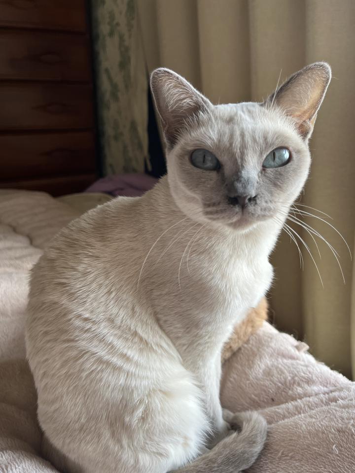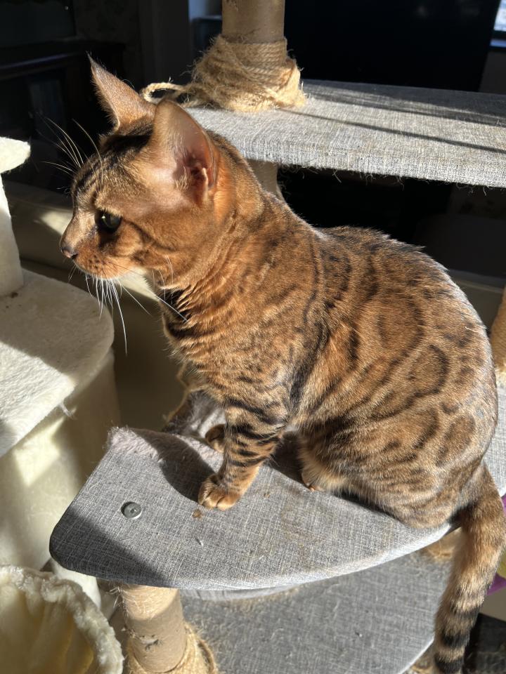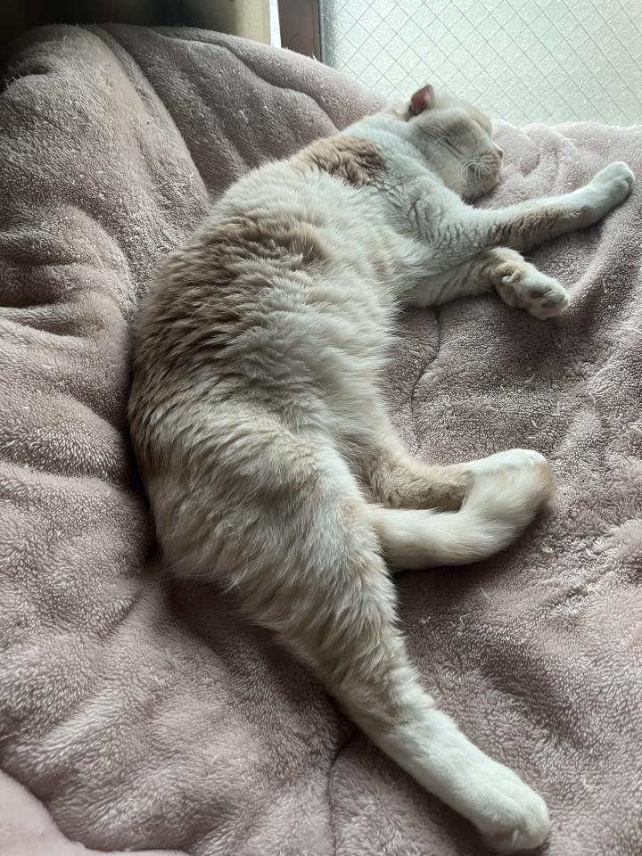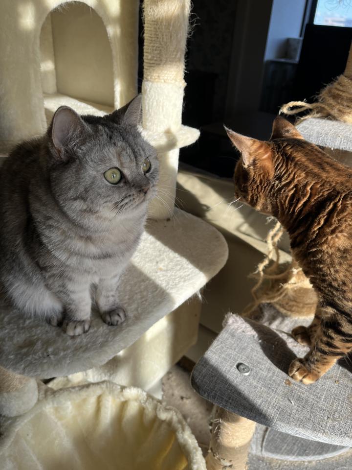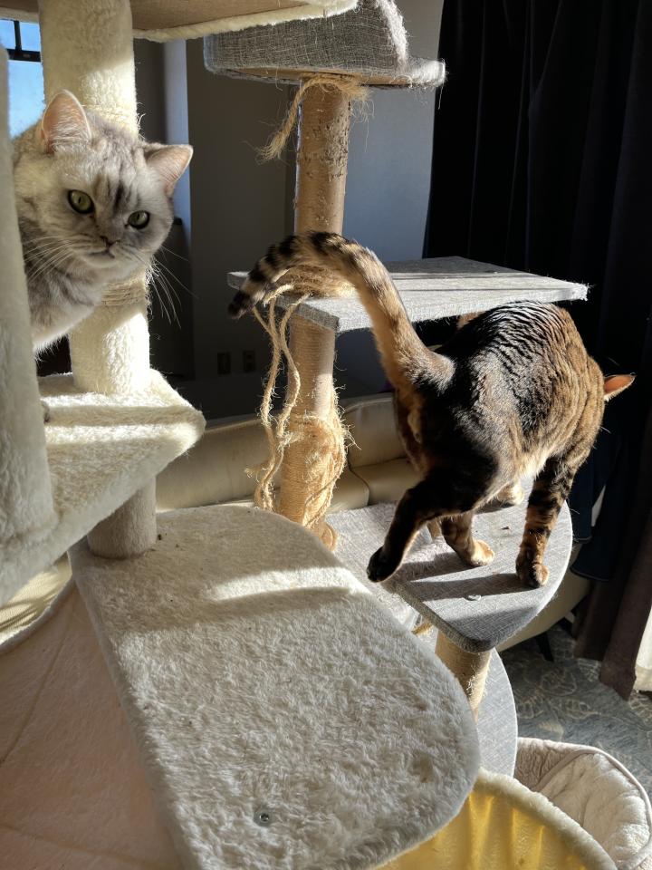 ももちゃんは白いキャットタワーにいることが多いけど、シューちゃんは古いのにいたりする