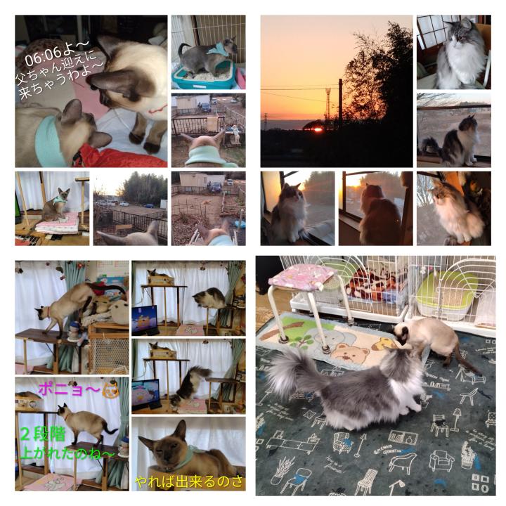 😻、父ちゃんの見送りのあと、キャットウォークの1段目に乗せると、
