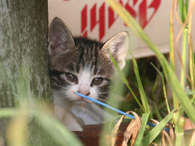 「????」と思い、周りを見ると、なんと物置横にある廃材の上で子猫が遊んでる。
