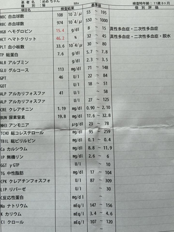 一昨日あたりから症状が出てきてご飯の食べ方がモソモソなので診てもらうついでに血液検査とかしてもらってきました。