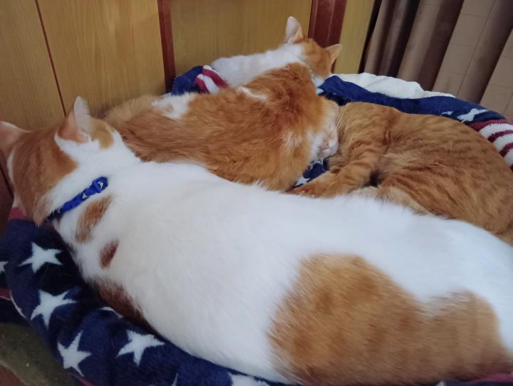 猫団子と言うよりパズルのピースのように、ベッドにはめ込まれていました