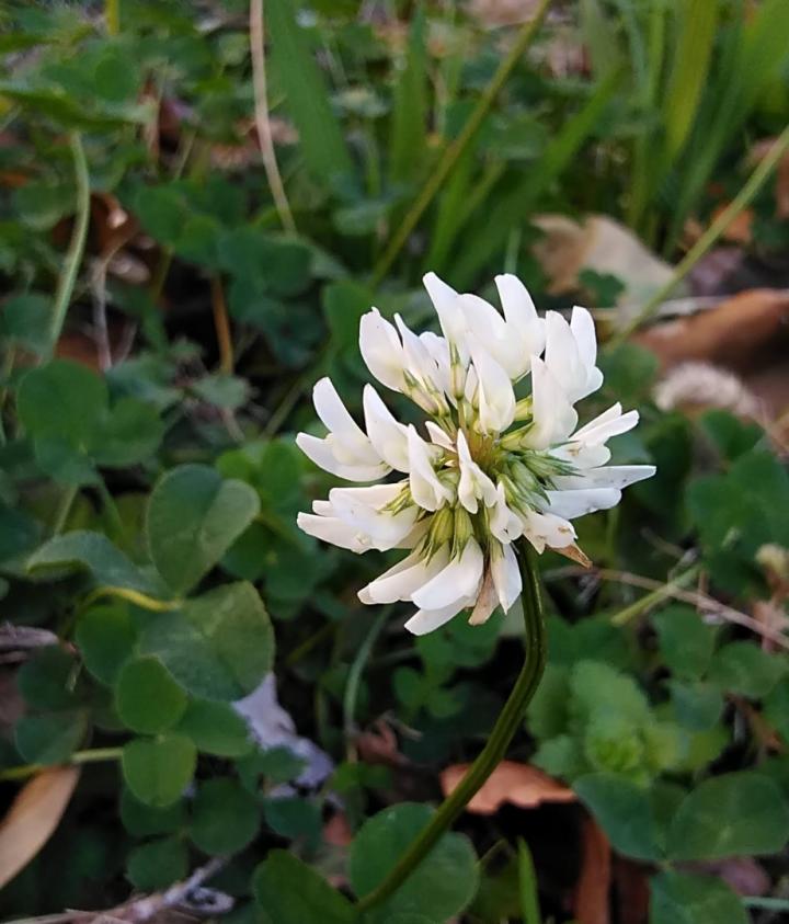 シロツメクサです。ヨーロッパ原産、マメ科の多年草。普通、花は春〜秋で