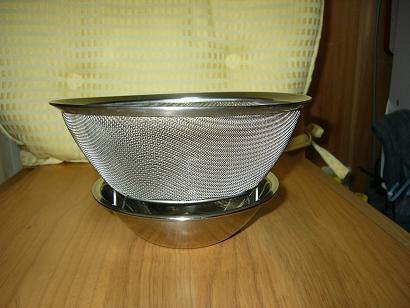 ザルを重ねたところ。高さが足りないので小型のボウルで高さ調節します