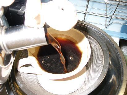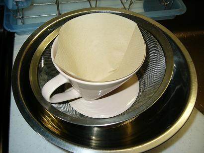 ④ 鍋か大型ボウルにザルを重ねその上にコーヒーを落とす用具を重ねて(手を離しても安定して、やかんのコーヒーが全部出てもコーヒーを落とす用具の底の部分が触れないように)、ペーパーフィルターをセットして、やかんの中身を注ぎ濾過します。