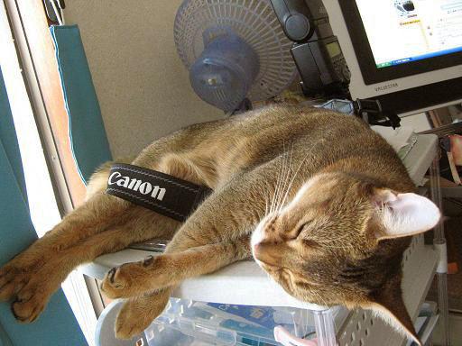 なぜか大嫌いなカメラのストラップに絡まって寝ております(笑)