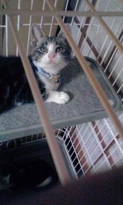 知人宅へ連れて行く時間を約束し、白雉くんとはちわれちゃんをかごの中に入れ、車で向かう。「どこいくの?」的に隙間から見上げてる2匹。