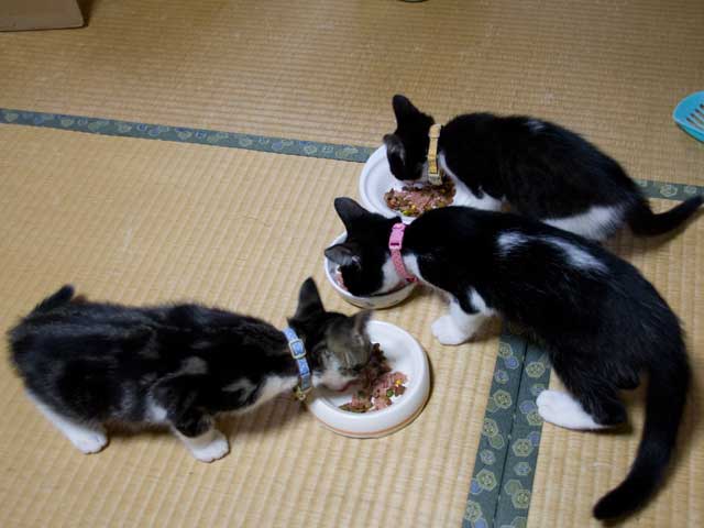 ぷくと3匹で仲良くご飯(奥からはちわれちゃん、ぷく、白雉君。ちなみにこの時ジジは、部屋の入り口でごろっと横になってました。笑